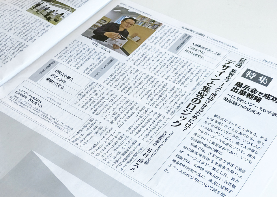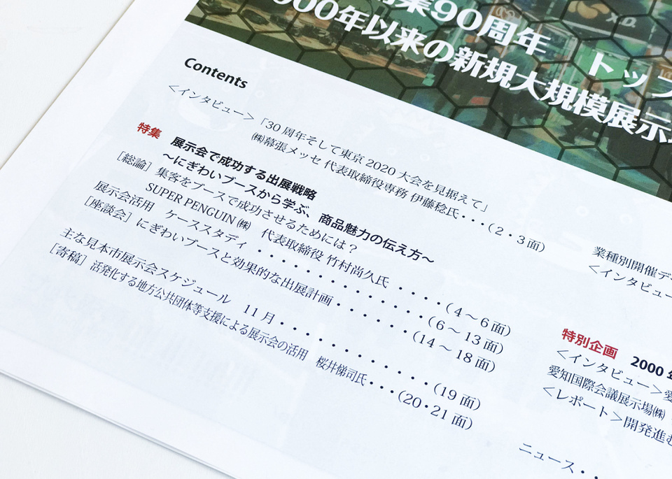 (株)ピー・オー・ピー様発行の「見本市展示会通信 秋季特集号」にて、当社代表竹村の記事が展示会集客の総論として掲載されています。展示会ブースにて集客する方法として、ブースをどのように考えて作るのか、単に「目立つ」「インパクトを出す」というものではなく、来場者心理に基づいた計画をすることについてお伝えさせていただきました。
